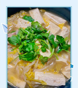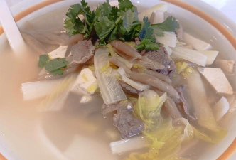 羊肉预处理:焯水后与花椒、大料、八角等香料同炖1小时。2. 豆腐加入:豆腐切块后放入汤中,炖10分钟。3. 调味收汁:加盐、生抽、老抽调味,勾芡后撒上香菜碎。
