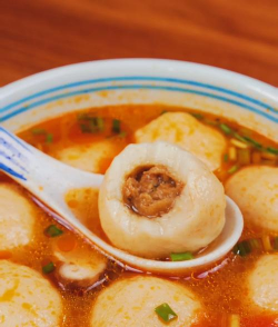 3. 水沸腾后放鱼丸,再沸腾后放葱、味精、排骨汤料。鱼丸最后放,当心煮久会化掉。