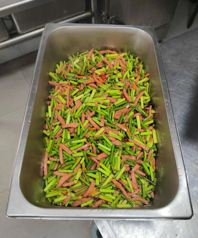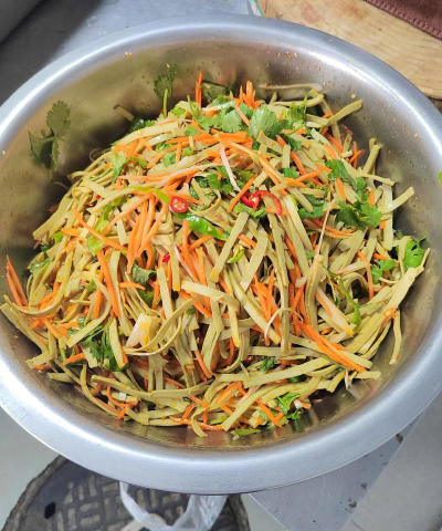蔬菜处理青红椒和蒜苗切丝,香菜切小段,大蒜切末,小米椒切小细圈。