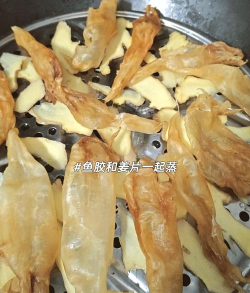 - 蒸汽锅加水烧开,放入鱼胶片蒸5分钟,焖2分钟后再用纯净水冲洗,去除腥味。 - 可额外用姜片煮水浸泡2-3分钟,进一步去腥。