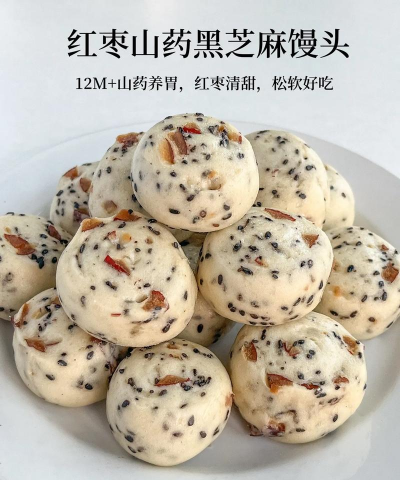 做法三食材:铁棍山药200克、中筋面粉200克、黑芝麻20克、红枣碎35克、酵母3克。