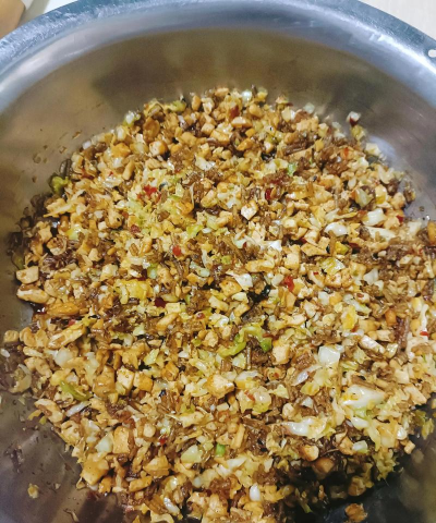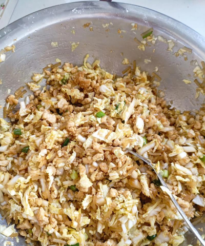 准备馅料白菜洗净切碎,加盐腌制10分钟后挤干水分。