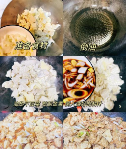 2. 锅中油烧热,下葱丁、姜末炝锅,下入豆腐翻炒,不怕碎,越碎越好。炒碎后加入酱油、精盐、香芹、葱丁,炒匀出锅。
