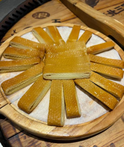 干豆腐切3寸×4寸方块后卷成1指宽的卷,用牙签串联(每串3-4个);