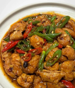 - 豆腐裹淀粉炸至金黄后,与炸好的辣子鸡块混合翻炒,加入豆瓣酱、花椒等调料,最后淋上香油提香。