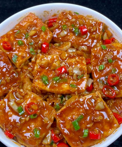 - 将豆腐盛出装盘,撒上葱花、香菜或辣椒粉点缀,增加风味。