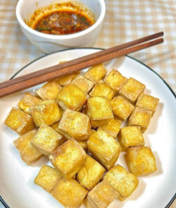 - 平底锅烧热至6成油,放入豆腐饼,中小火煎至两面金黄酥脆,约需3-5分钟。