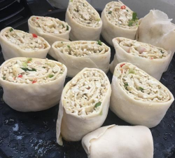 在每个薄饼上均匀铺上一层调好的豆腐馅料。