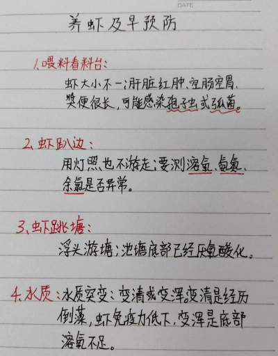 - 通过观察水色(黄绿色/茶褐色)和虾的活动(浮头、摄食)判断水质健康。
