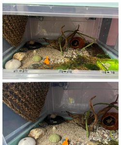 - 鱼缸需足够大,建议按生物种类划分区域,例如设置虾区、鱼区、沉木区等。