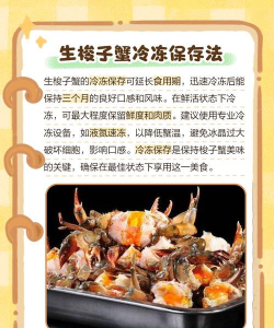 :清洗后密封冷冻,可保存1个月。蟹类保鲜- 用绳子捆住蟹脚减少活动量,覆盖湿毛巾放入冰箱保鲜层,建议1周内食用完毕。
