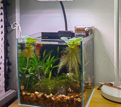 - 种植水草(如莫斯、矮珍珠)提供藏身处和氧气来源,浮萍可吸收NO3并控制藻类爆发。