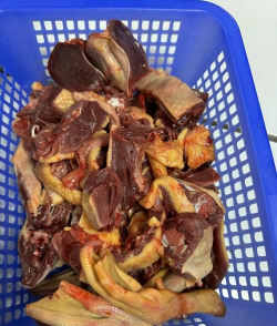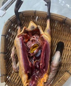 煮熟后观察: 土鸭皮呈金黄色或浅黄色,饲料鸭皮多为白色。 触感对比