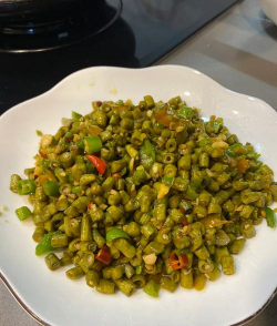 - 炒香姜片、葱段和花椒,加入焯水后的鸭块翻炒至水汽收干。