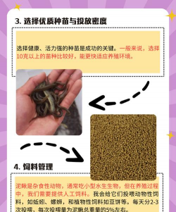 - 避免过量投喂导致水质恶化,投喂后及时清理残渣。育苗期(1-2个月)投喂基肥(有机肥或粪肥),生长后期逐步过渡到商品饲料。