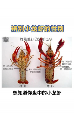 雌雄鉴别:雄虾第1、第2腹足演变成白色、钙质的管状交接器;雌虾第1腹足退化,第2腹足呈羽状。此外,雄虾螯较大,腕节、掌节上的棘突长而明显;雌虾的螯相对较小。