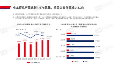 2023年小龙虾产值达到4676亿元,同比增长2.1%,预计2024年行业规模有望突破4974亿,同比增长6%。