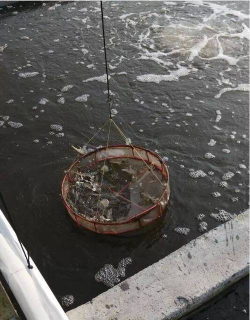 > 在饲料台附近,对虾出现了白浊的现象(可能是水质问题,也可能是虾体异常)。