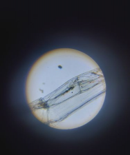 将一小段肠道置于载玻片上,加一滴生理盐水。