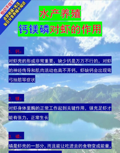 淡水对虾在养殖过程中,补钙、镁、钾等矿物质元素非常重要,这些元素对虾的生长、蜕壳、免疫力以及水质调节都有重要作用。下面我来详细解释一下为什么需要补钙、镁、钾,以及如何合理补充。