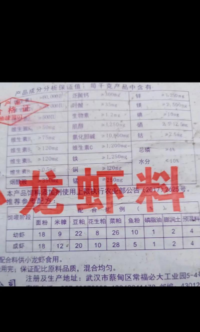 成虾配合饲料配方配方1:麦麸50%,蚕蛹30%,豆饼10%,米糠5%,花生饼5%。