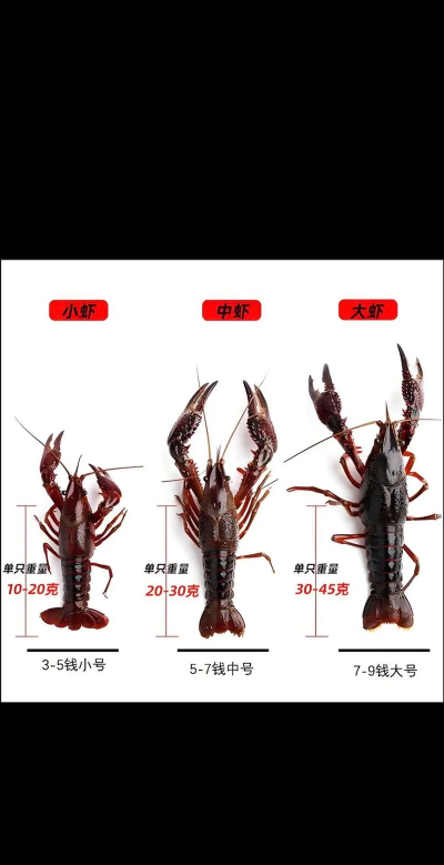 此外,根据小龙虾的重量和颜色,还可以将小龙虾分为以下几种型号: