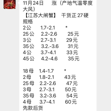 宁波螃蟹市场的价格如下:四两以上的毛蟹价格为四十来块。三两以上的毛蟹价格为三...