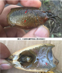 头胸甲异常:头胸甲上出现白色圆形斑点,严重时白点连成白斑,甲壳易剥离。