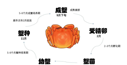 从蟹苗到成蟹需要 18个月左右。其中,从蟹苗养成豆蟹需要8个月,从豆蟹养殖成熟则需要10个月。