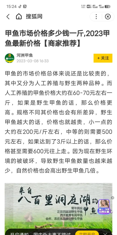 3. 目前人工养殖甲鱼的价格大约在60到80元每斤左右,而野生甲鱼的价格则明显高于人工养殖的甲鱼,最低也要300元一斤。