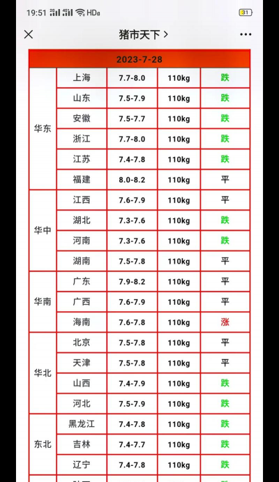 冷链配送生猪价格表格
