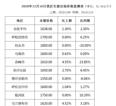 内蒙古地区生猪价格