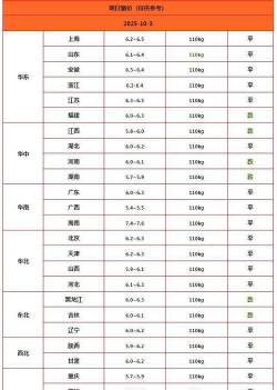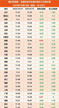 全国均价:10月中旬,全国生猪(外三元)均价已跌破11元/公斤,如10月12日跌至10.94元/公斤,较9月底的12.24元/公斤进一步下滑,部分省份(如广西)甚至低至9.99元/公斤。