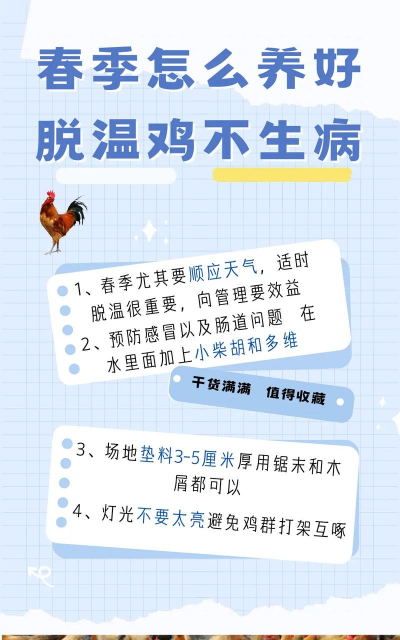 - 降温时减少通风量,但需保证氧气供应。通风口高度宜高于鸡背1.5米,避免冷风直接吹入。