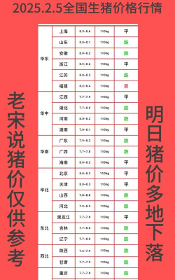 三、未来趋势预测短期: 价格走势受市场情绪和屠宰采购主导,预计南方地区价格下跌趋势可能延续,北方市场或保持稳定; 中长期