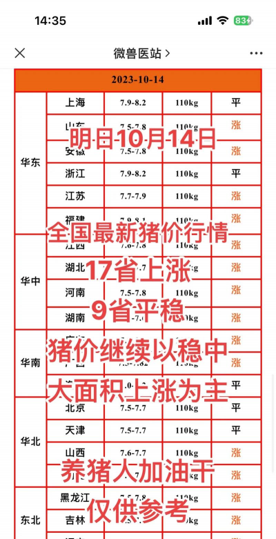 根据最新数据,2025年10月23日河南省生猪价格呈现上涨趋势,具体信息如下:价格范...