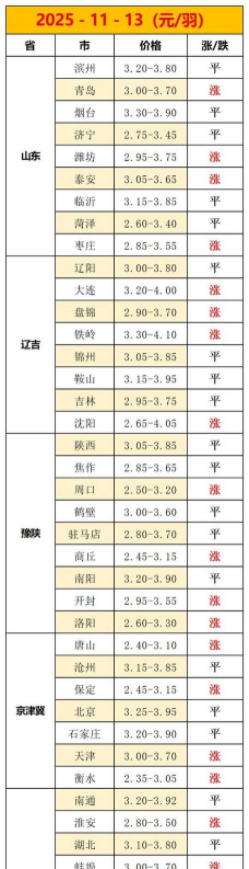 - 其他地区如河北、北京、河南等地价格集中在15-20元/只区间。