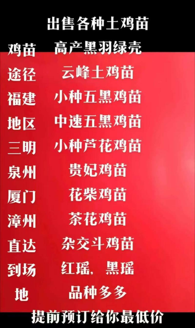 - 五黑绿壳蛋鸡苗:3.3元/只(公鸡)