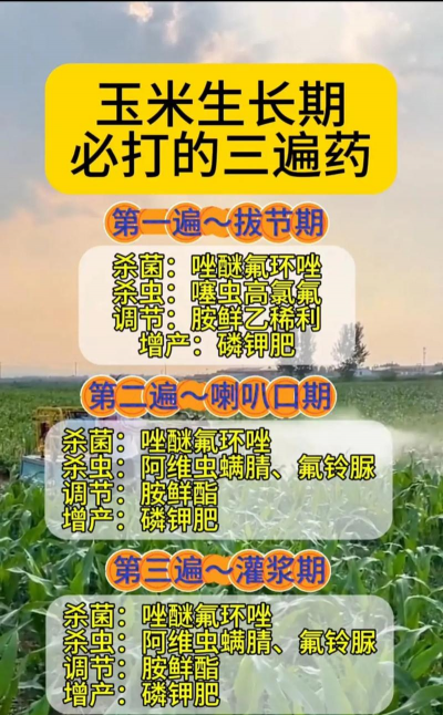 大喇叭口期至抽雄期- 需喷施一次综合药剂,包括杀虫剂(如甲维盐、吡虫啉)、杀菌剂(如戊唑醇、嘧菌酯)及叶面肥(含氮/磷/钾),以防治玉米螟、锈病、大小斑病等,促进授粉和籽粒灌浆。