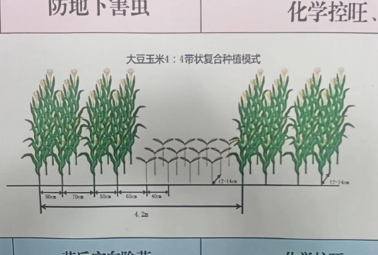 - 四行玉米六行大豆: 玉米行距60cm,株距18cm;大豆行距40cm,株距15cm,面积比50:50。 - 二行玉米四行大豆