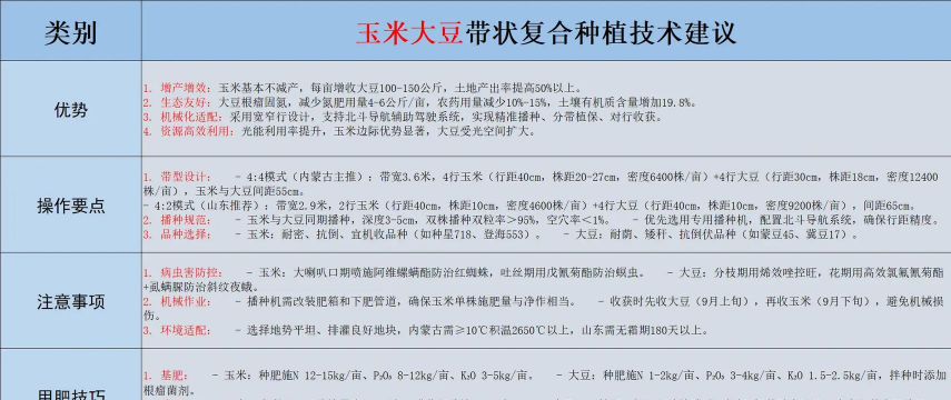 - 种肥同播:玉米带基施45%复合肥,大豆播后追施专用种衣剂。