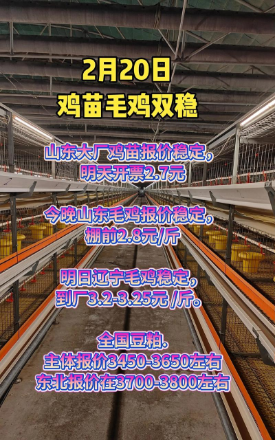- 山东大厂(如潍坊、德州等)肉食鸡苗报价稳定在 3.20元/羽