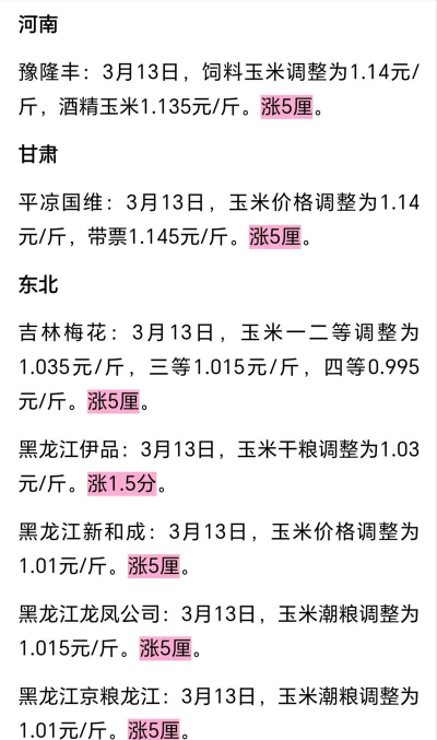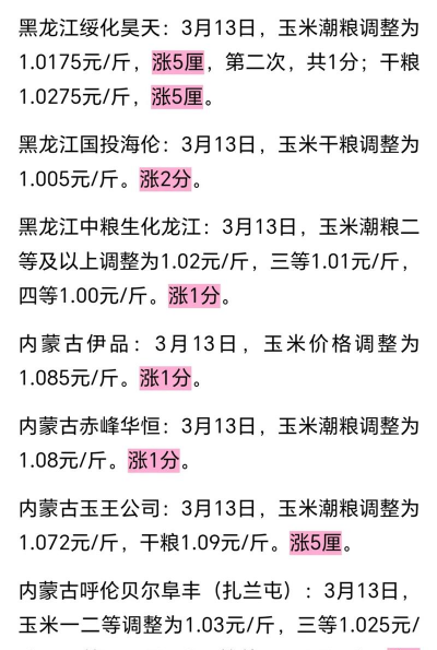 三、价格波动因素区域差异: - 东北产区(如黑龙江):1.42-1.6元/斤 - 南方产区(如云南):1.3-2.9元/斤 - 普遍范围:1.39-1.6元/斤 - 收购量增加(如山东加工企业开工率高):价格上浮 - 需求下降(如养殖规模减少):价格承压