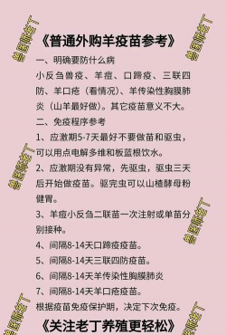 - 幼羊2-3周龄开始接种口蹄疫、小反刍兽疫等疫苗,成年羊每年春秋两季进行全面免疫。