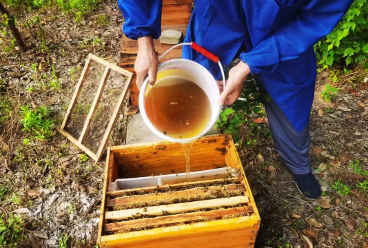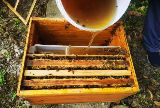 - 用蜂蜜加温水(结晶蜂蜜需煮化)稀释后,通过灌脾或框式饲养器喂食,可配合糖浆使用。