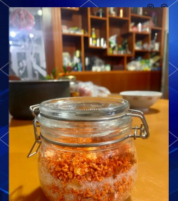 - 分层摆放桂花与蜂蜜,密封容器中多次淋蜜并覆盖保鲜膜发酵3-5天。