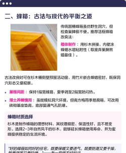 五、现代与传统结合传统方法如木桶土法适合小规模、低强度养蜂,而现代技术(如格子箱养蜂)在效率和管理上更具优势。实际应用中可根据地理环境、资源条件灵活选择,甚至融合传统智慧与现代管理手段。