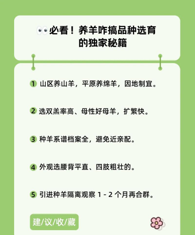 - 结合当地羊肉/羊毛市场需求,选择具有市场竞争力的品种。 - 考虑养殖成本,如杜泊羊适应性强可降低饲料成本。 三、选种方法