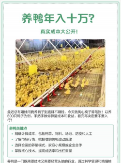 养一只鸭子的成本会根据多种因素而有所不同,包括:1. 鸭子的品种(如肉用鸭、蛋用...