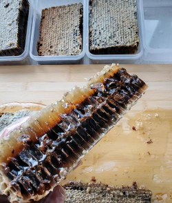- 利用旧巢脾下方的黑旧部分切掉,让蜜蜂在残留部分重新修造新脾。此方法成本低,但新脾较脆弱,易碎且运输时易损坏,建议在造脾季(春末秋初)使用。